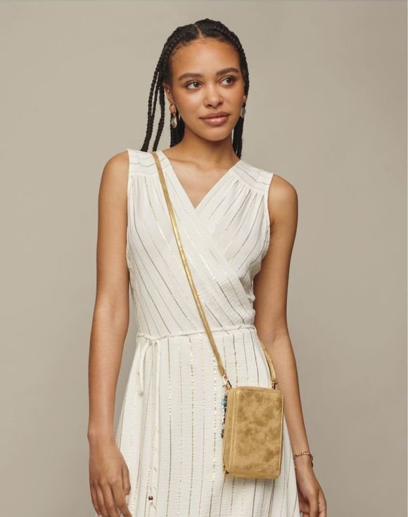 Hands-free. Hassle-free. Adventure-ready. A distressed golden metallic phone case features an adjustable crossbody strap and zipper closure for modern utility. Includes outside and inside slotted pockets. Imported.