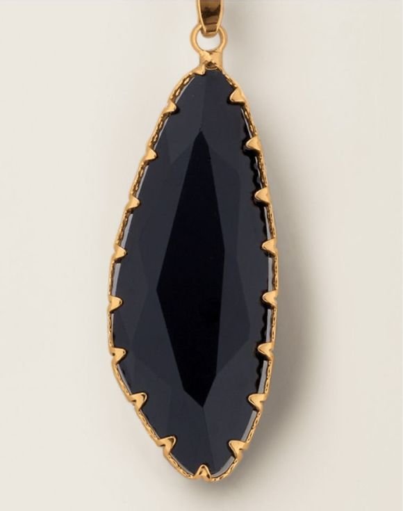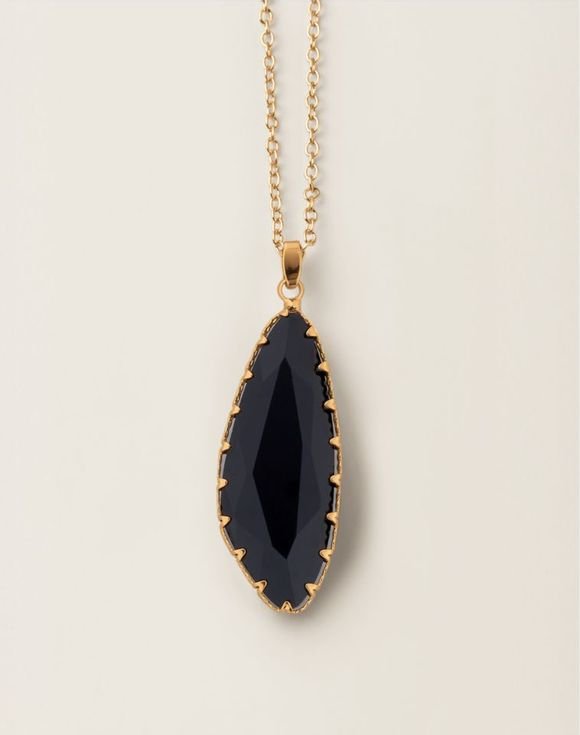 Complete your look with a hint of glamour. A sleek black glass pendant, shaped like a delicate leaf, hangs from a refined goldtone chain for a striking contrast that turns heads day or night.