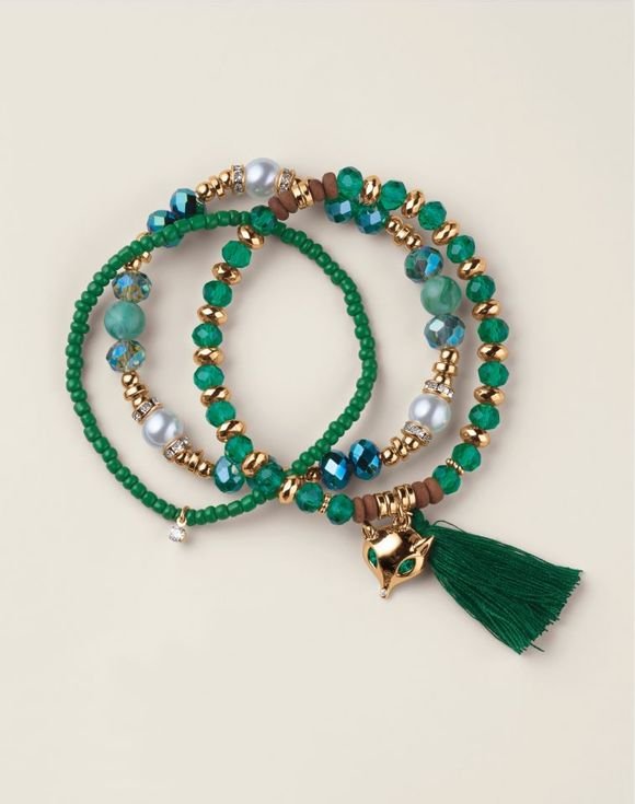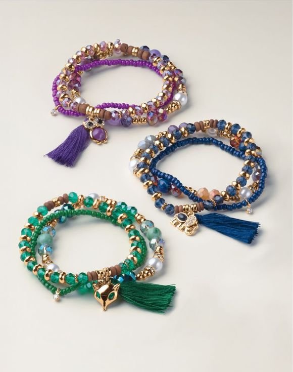 Stack on the charm with a touch of animal flair. A playful mix of colorful glass, pearly and wood beads with a delightful animal charm makes for instant arm candy. Available in three styles: owl (purple), elephant (blue) and fox (green).