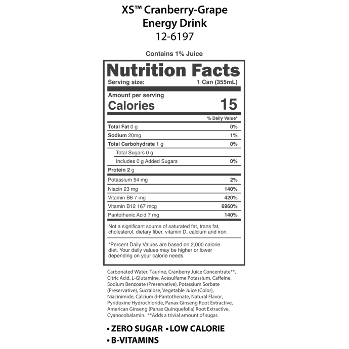 Bursting with a delicious, refreshing cranberry-grape taste, this XS™ Energy Drink is packed with just the right amount of caffeine and B vitamins, yet it doesn’t contain the level of sugar and carbs found in other popular energy drinks.