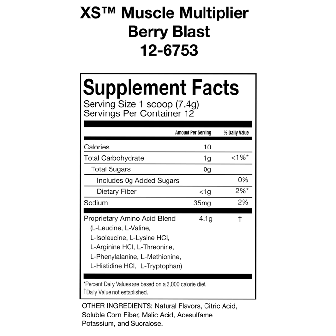 Daily use of XS™ Muscle Multiplier*† for 10 weeks is clinically proven to increase lean muscle mass, power and strength while reducing body fat and fueling muscle recovery when combined with regular resistance training and a balanced diet.† Powered by all 9 essential amino acids plus 320g of L-Arginine, each serving of XS™ Muscle Multiplier*† provides 4.1g of powerful essential amino acids with zero sugars and no artificial colors, flavors or preservatives.