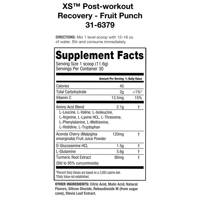 GIVE MUSCLES THE ASSIST THEY DESERVE! – XS™Post-Workout Recovery supplement supports muscle recovery and joint health so you can rebound faster and experience more.† Created with a blend of L-Glutamine, XS™ Muscle Multiplier*† amino acid blend and joint-supporting ingredients turmeric and glucosamine.† Enjoy all the benefits of this powder drink supplement in a naturally flavored Fruit Punch.